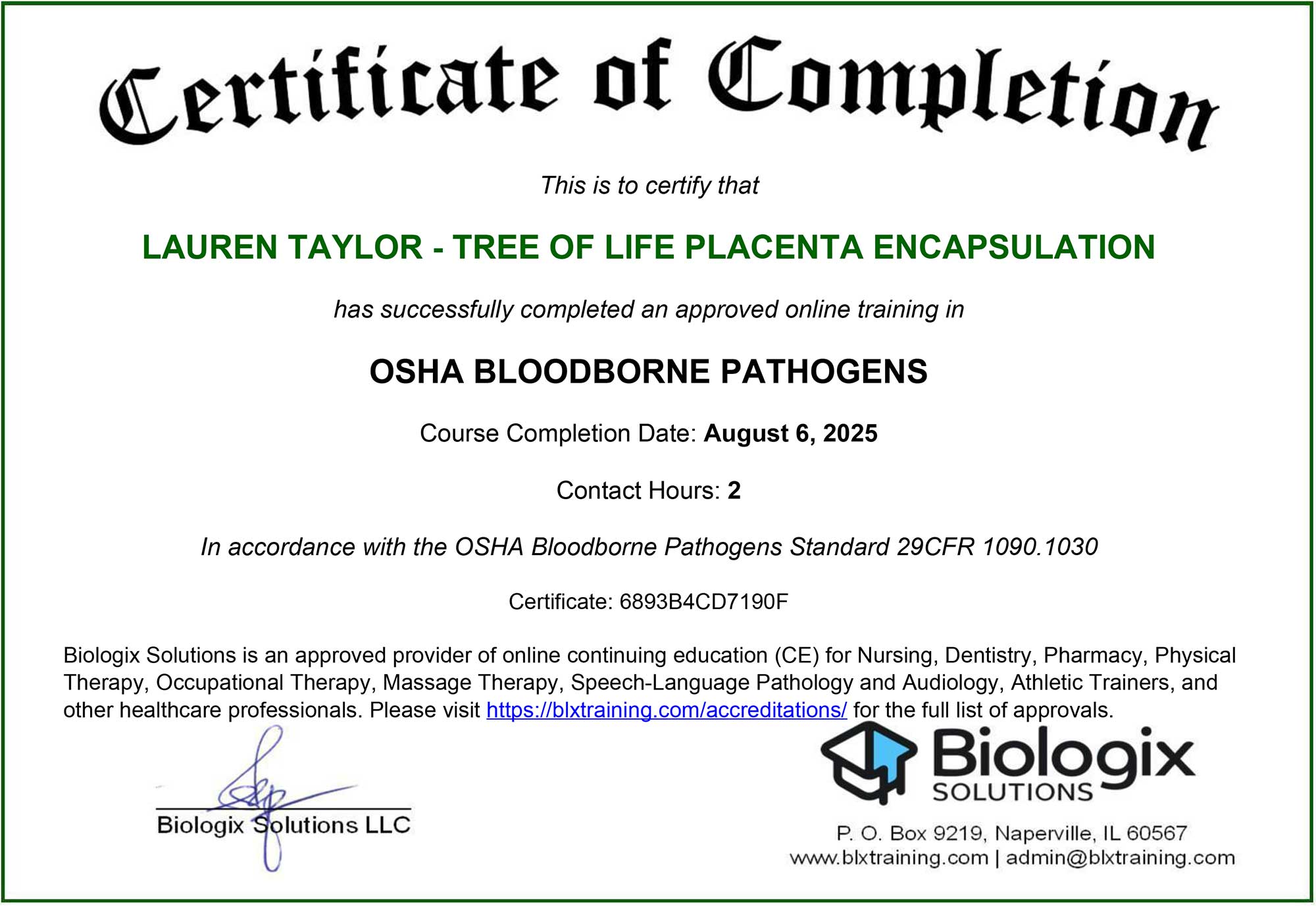 - Lauren has a current "OSHA Bloodborne Pathogens for Placenta Encapsulation Professionals" certificate through Biologix Solutions