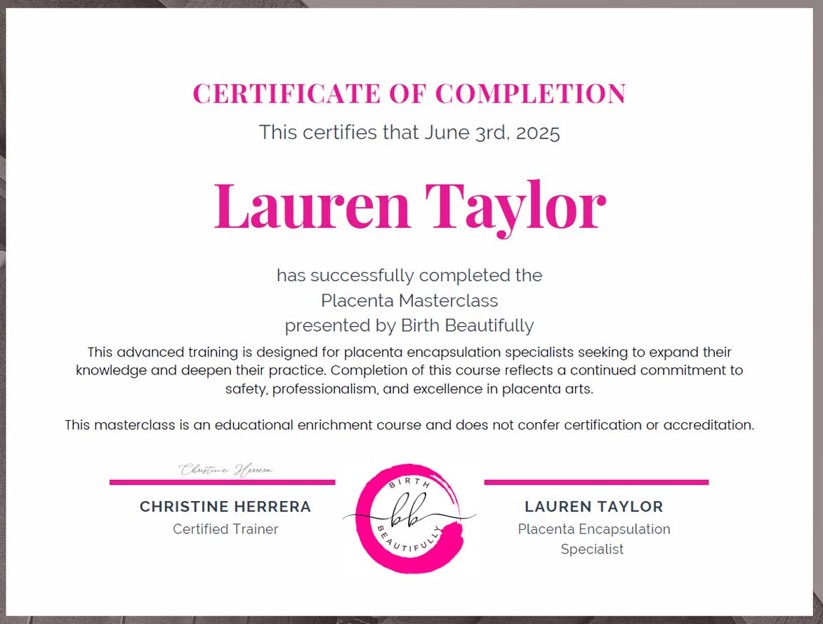 - Lauren holds a 3rd Placenta Encapsulation Masterclass Certification through Birth Beautifully (2025)